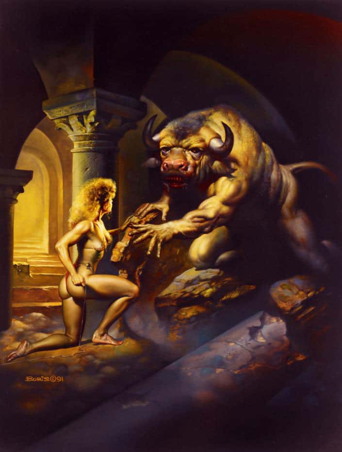 Acordando de repente, o Minotauro salta mugindo sobre o rapaz. Mas o herói está alerta e, sem medo nem hesitação, abate de um só golpe o monstro.